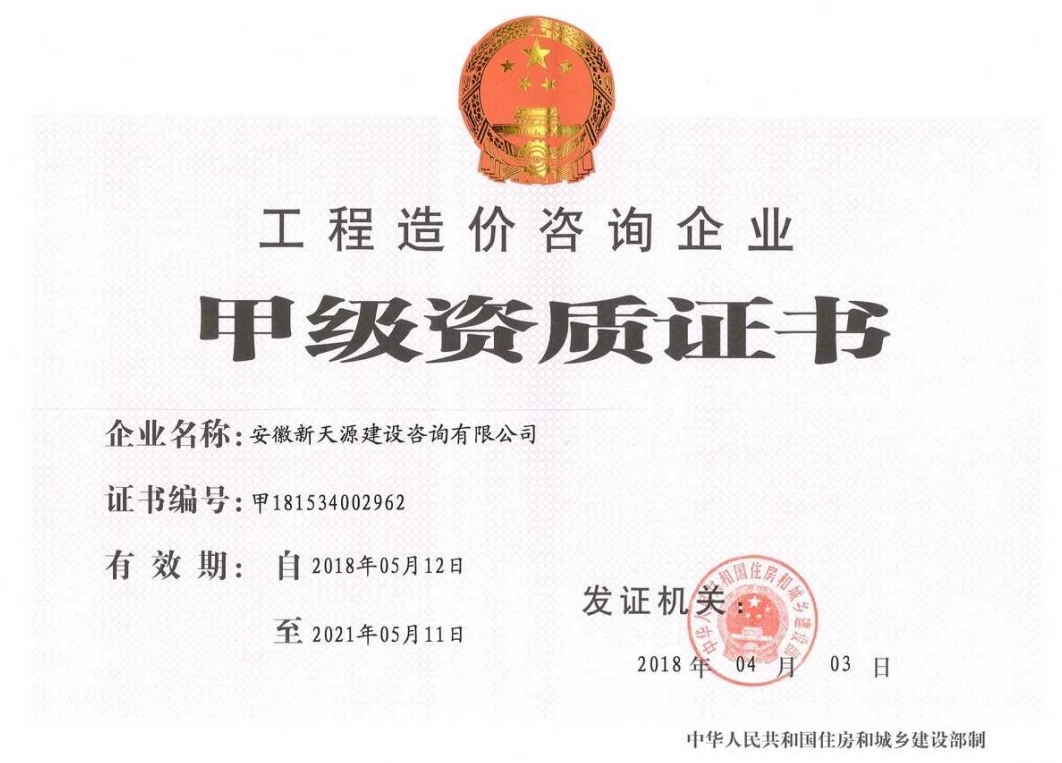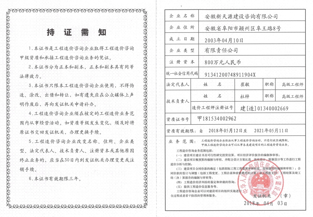 2008年11月取得工程造價資質(zhì)證書并成為阜陽市審計局審計協(xié)審定點(diǎn)單位;